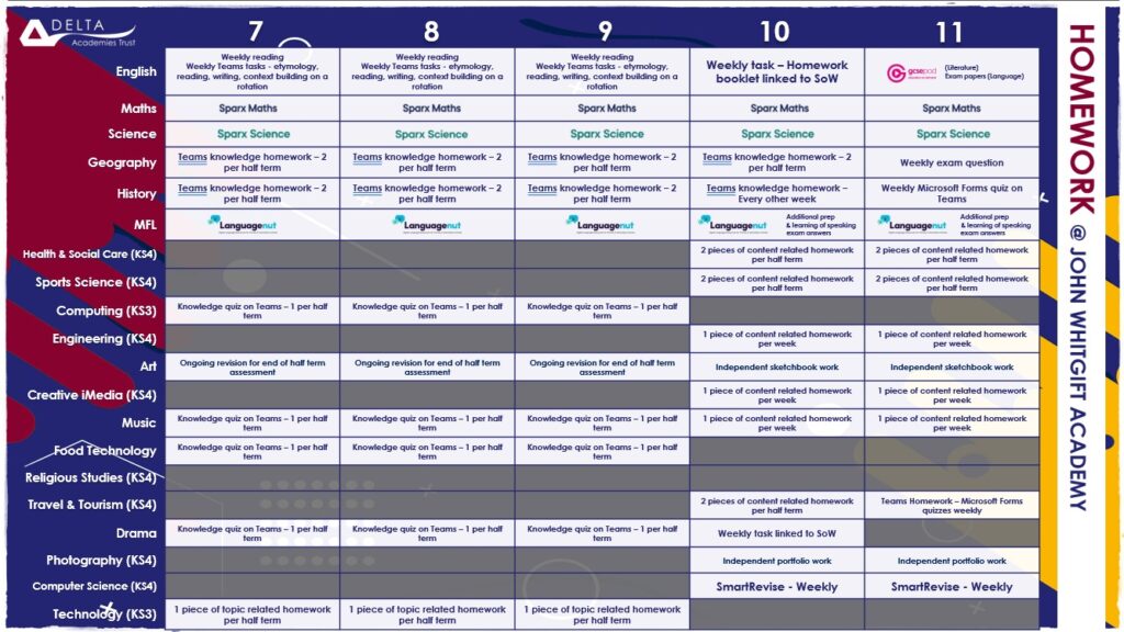 These can be found in the year group Teams on the student VLE or on the homework webpage.